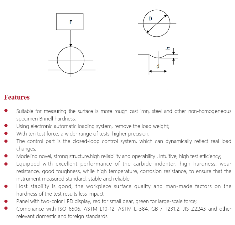 Brinell hardness test: Test force (F) is on the steel ball with certain diameter(D) , pressed on sample surface. After a period of time, cancel the force. The indentation diameter is get by measuring with micrometer ocular, thus to calculate the average pressure(N/mm2).
