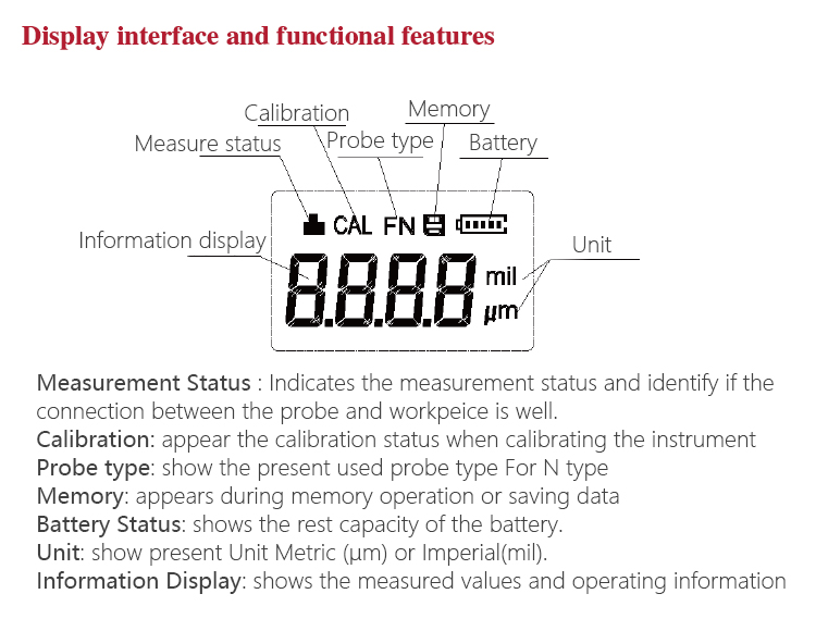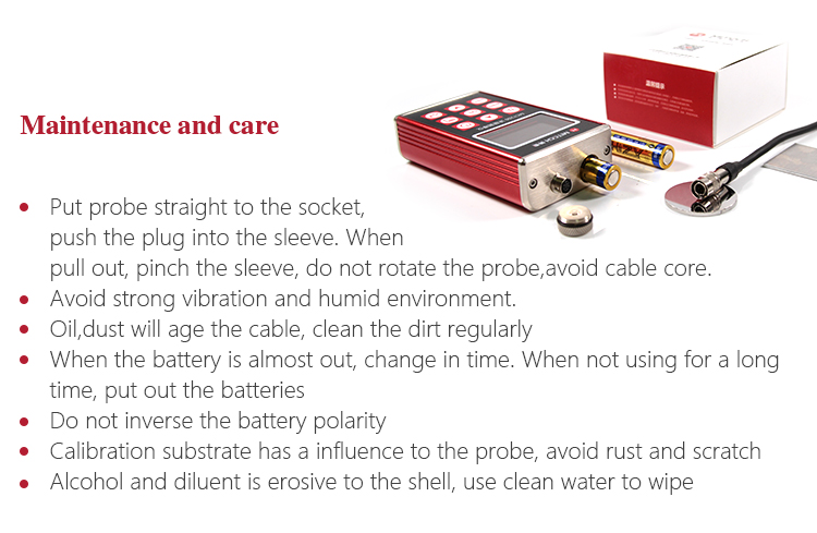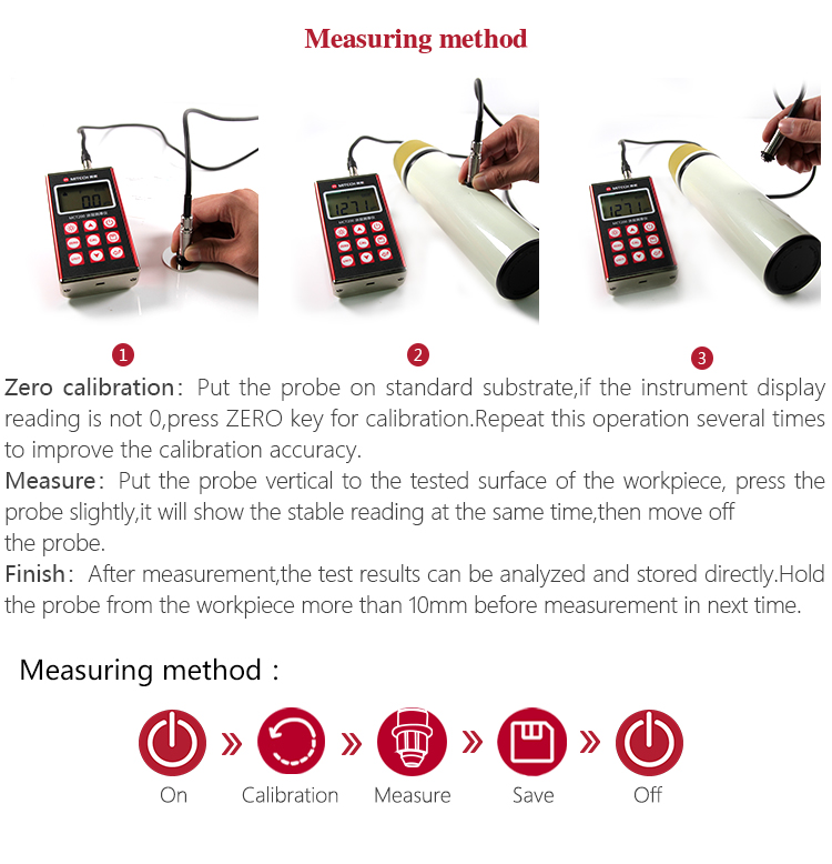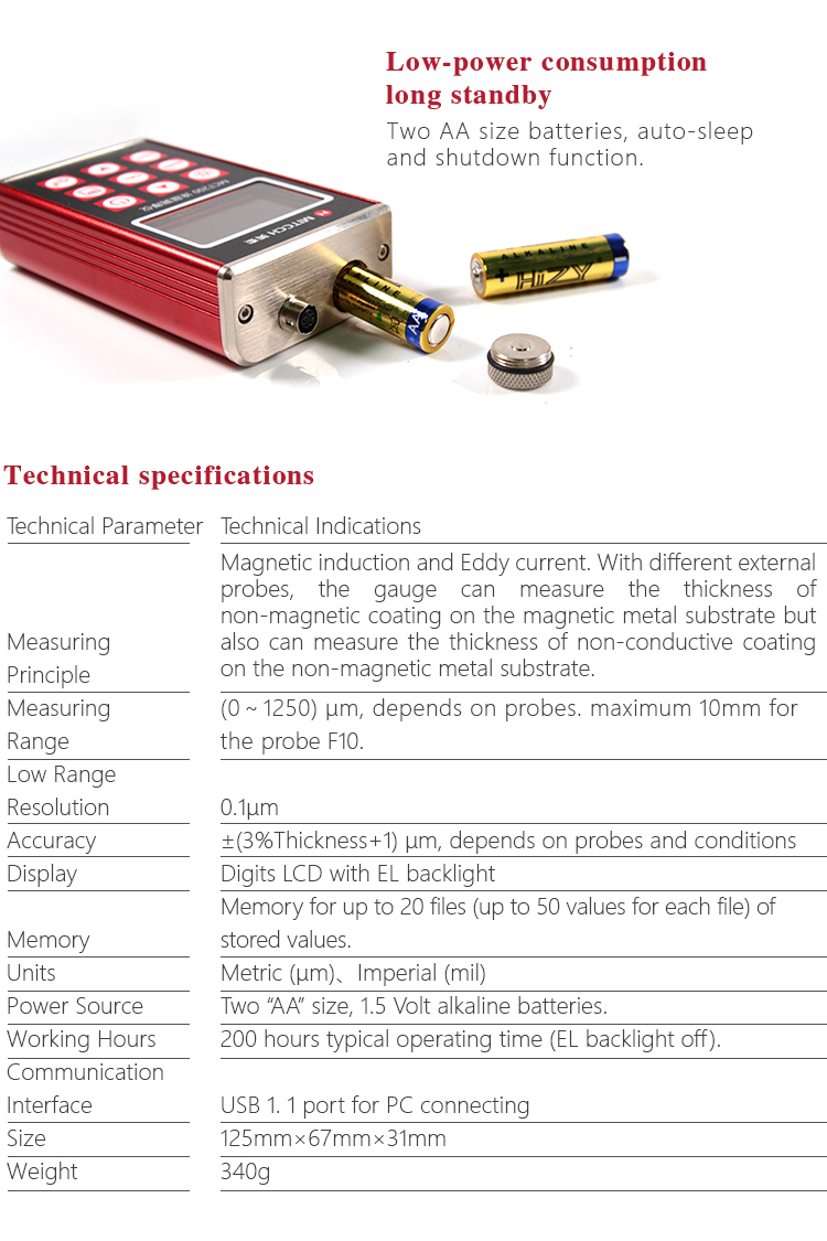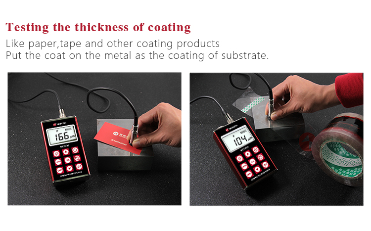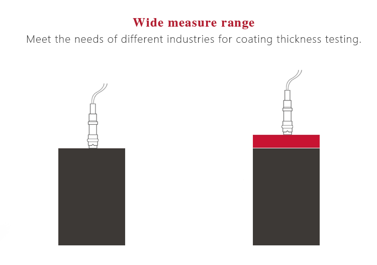 With different external probes, the gauge can be applied to measuring thickness of non-magnetic coating on magnetic metal substrate, as well as non-conductive coating on non-magnetic metal substrate.
