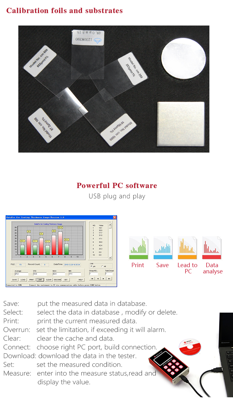 The gauge equips with data-pro software, can do measurement results transmission, automatic storage management, measurement data analysis, measurement reports print etc.