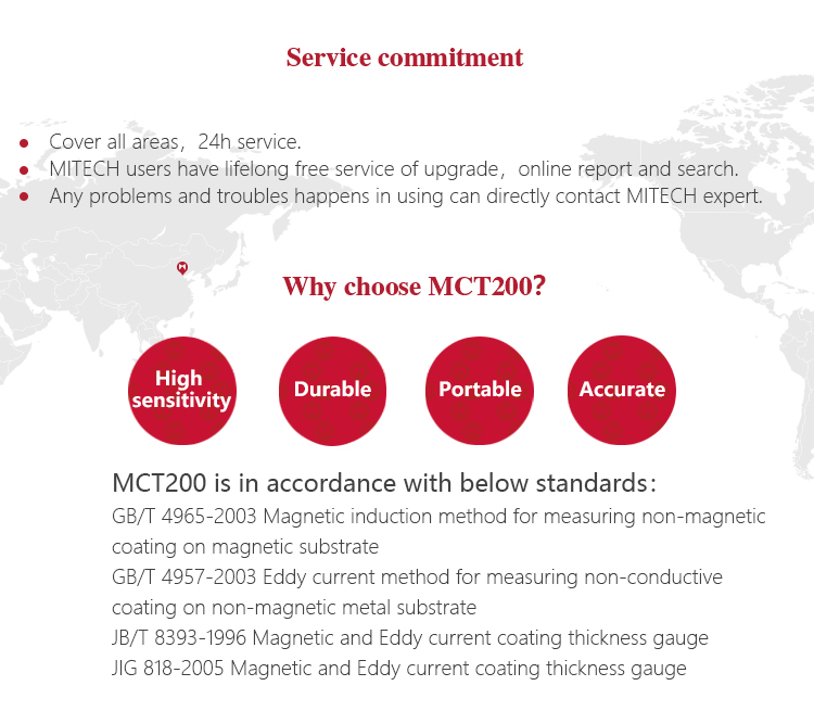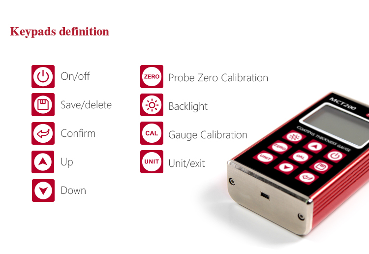 Product OverviewMCT200 Coating Thickness Gauge is designed for non-destructive, fast and precise coating thickness measurement and also can measure the film thickness. It is widely used in manufacturing,metal processing industry, chemical industry.commodities inspection and other testing areas. Measuring range from 0 to 10 mm, can meet the different industries in view of the workpiece surface coating thickness testing requirements. It is the necessary professional precision instrument to improve the production efficiency and the qualified rate, saving the cost of production.