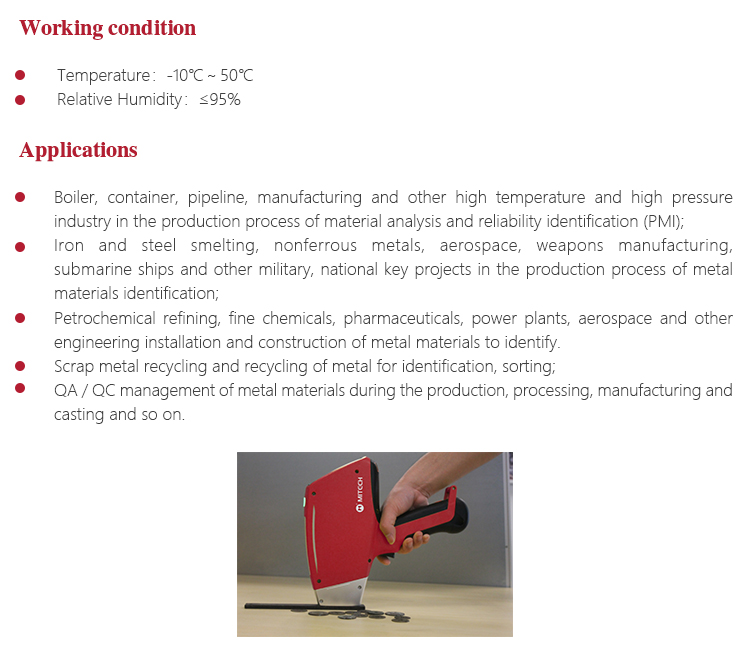 Product OverviewMITECH MAS860 Portable spectrometer, also called alloy analyzer. It adopts the principle of energy and wavelength differences in X-ray generated by metal atoms when energy level flips, so as to analysis element type and content in alloy material. Small size and light weight makes it convenient to work on site. It is easy to operate without tricky skills. A variety of elemental content can be measured at once in solid/powder/liquid sample detection. It is also designed with low consumption, high speed analysis and high accuracy; widely used in the field of analysis of elements such as boiler containers, petrochemical refining, iron and steel smelting, nonferrous metals, aerospace, weapons manufacturing and other elements that need to analyze Na or above to U. MAS 860 is a necessary professional precision instrument to improve the production efficiency and pass rate as well as cost savings.