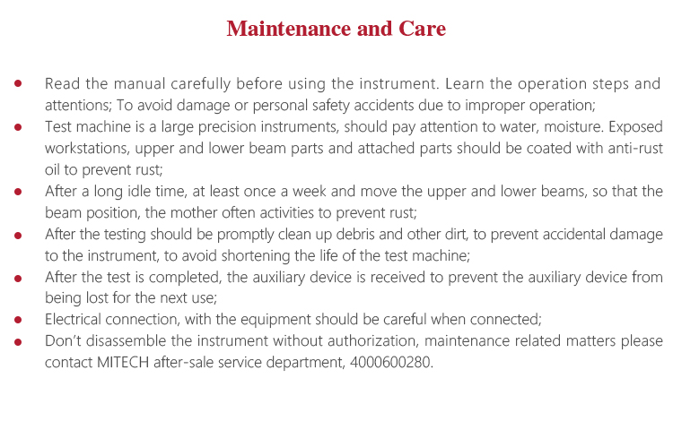 l Test machine is a large precision instruments, should pay attention to water, moisture. Exposed workstations, upper and lower beam parts and attached parts should be coated with anti-rust oil to prevent rust;