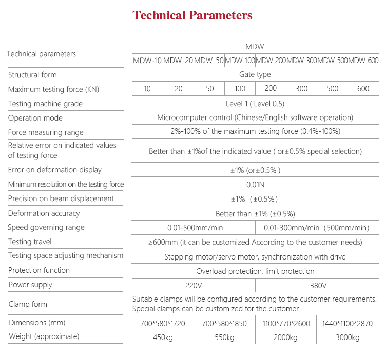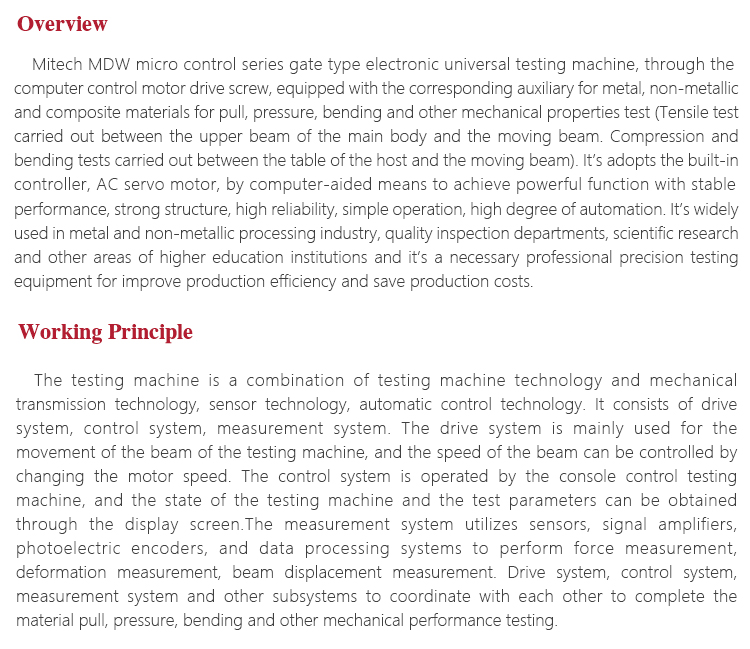 Mitech MDW micro control series gate type electronic universal testing machine, through the computer control motor drive screw, equipped with the corresponding auxiliary for metal, non-metallic and composite materials for pull, pressure, bending and other mechanical properties test (Tensile test carried out between the upper beam of the main body and the moving beam. Compression and bending tests carried out between the table of the host and the moving beam). It’s adopts the built-in controller, AC servo motor, by computer-aided means to achieve powerful function with stable performance, strong structure, high reliability, simple operation, high degree of automation. It’s widely used in metal and non-metallic processing industry, quality inspection departments, scientific research and other areas of higher education institutions and it’s a necessary professional precision testing equipment for improve production efficiency and save production costs.
