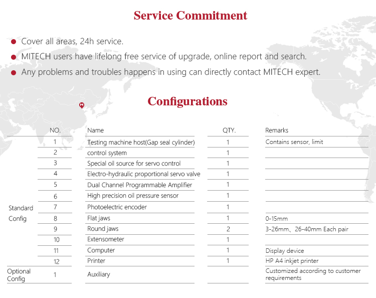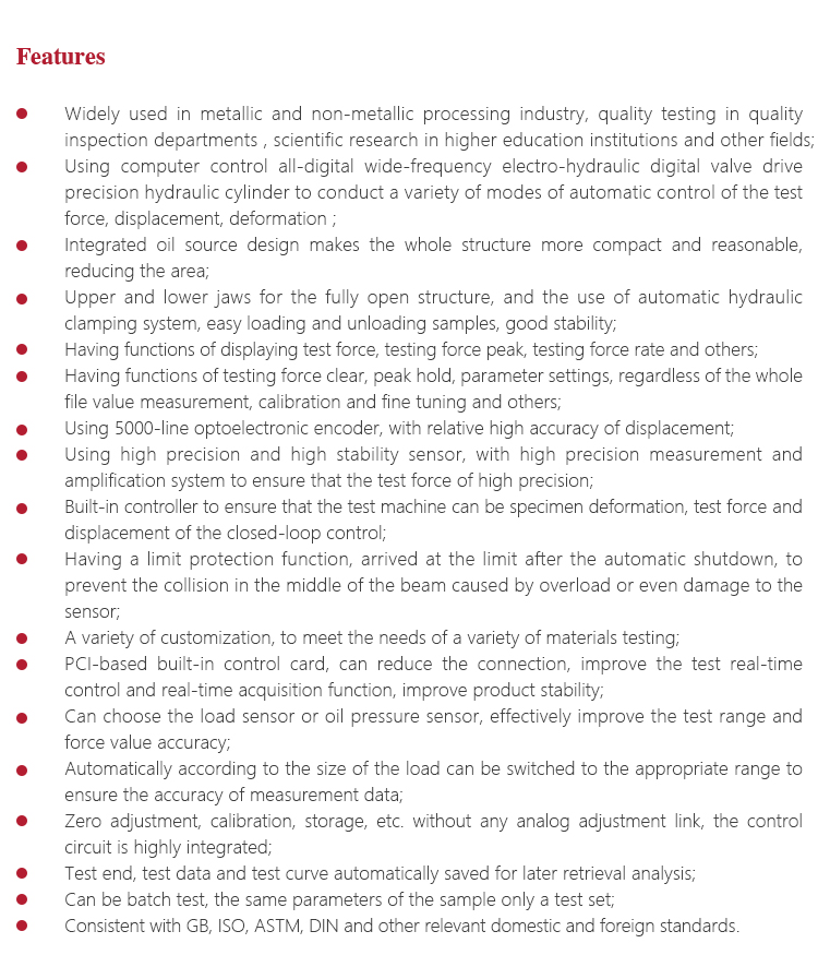 Mitech MAW micro control series hydraulic universal testing machine , can conduct mechanical properties tests for metallic, non-metallic and composite materials including stretching, compression, bending, cutting, stripping, tearing and so on ,through controlling the high-pressure pump to drive the screw movement and equipped with the corresponding auxiliary. It uses manual and electro-hydraulic servo dual control mode, high-precision gap sealed cylinder, digital processing, closed-loop control technology, which has stable property, powerful function, accurate data processing, solid and simple structure, high reliability, simple performance, friendly interface. This product can be widely used in areas such as metallic and non-metallic processing industry, quality testing in quality inspection departments, scientific research in higher education institutions , which is a necessary professional precision testing equipment to improve production efficiency and save production costs