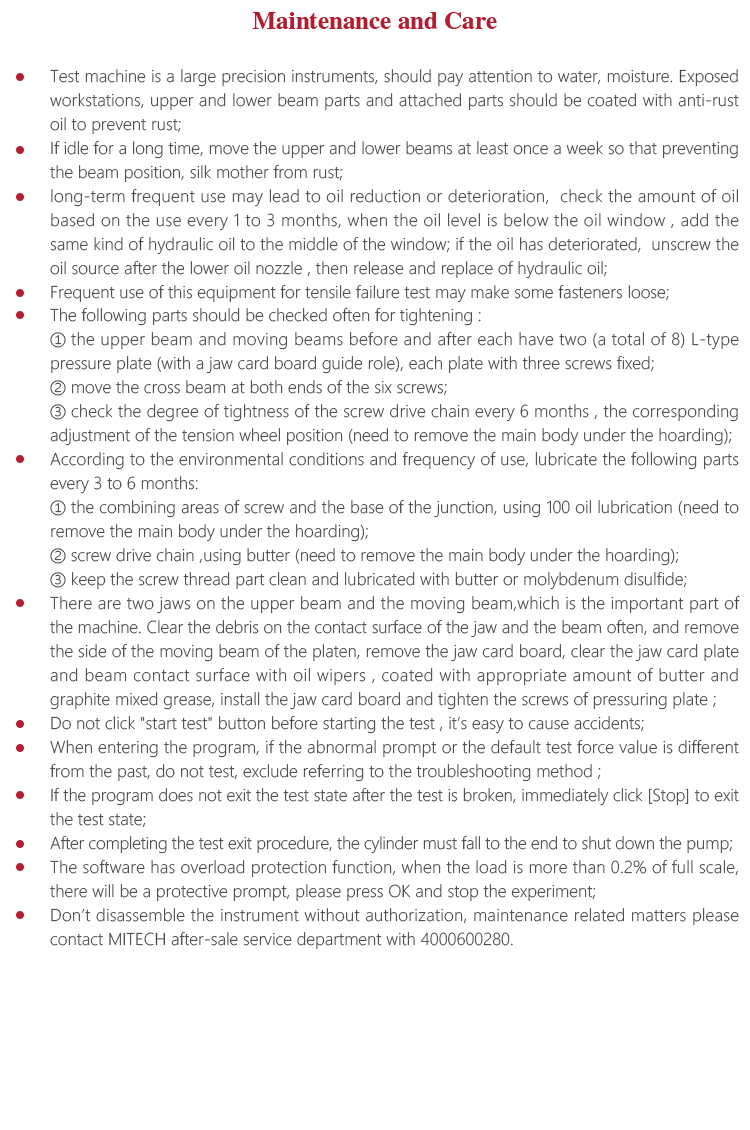 <!--[if !supportLists]-->       l <!--[endif]-->Test machine is a large precision instruments, should pay attention to water, moisture. Exposed workstations, upper and lower beam parts and attached parts should be coated with anti-rust oil to prevent rust;
