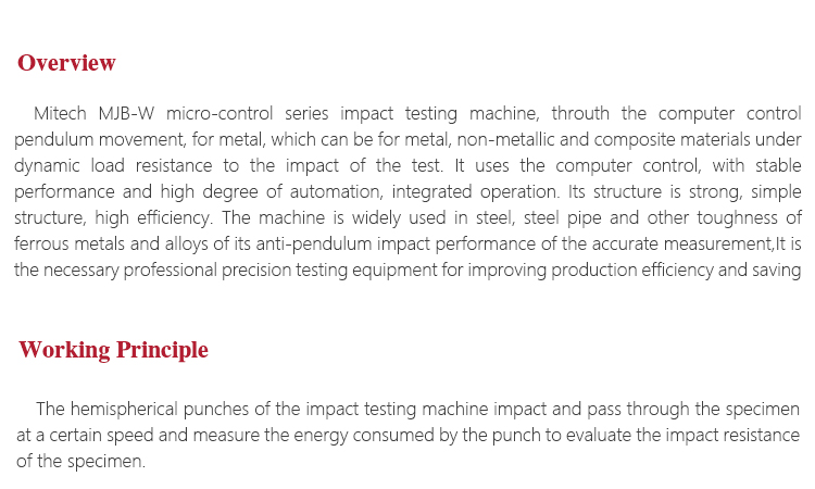 Mitech MJB-W micro-control series impact testing machine, throuth the computer control pendulum movement, for metal, which can be for metal, non-metallic and composite materials under dynamic load resistance to the impact of the test. It uses the computer control, with stable performance and high degree of automation, integrated operation. Its structure is strong, simple structure, high efficiency. The machine is widely used in steel, steel pipe and other toughness of ferrous metals and alloys of its anti-pendulum impact performance of the accurate measurement,It is the necessary professional precision testing equipment for improving production efficiency and saving production costs.