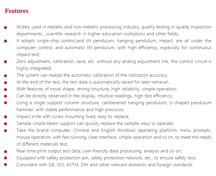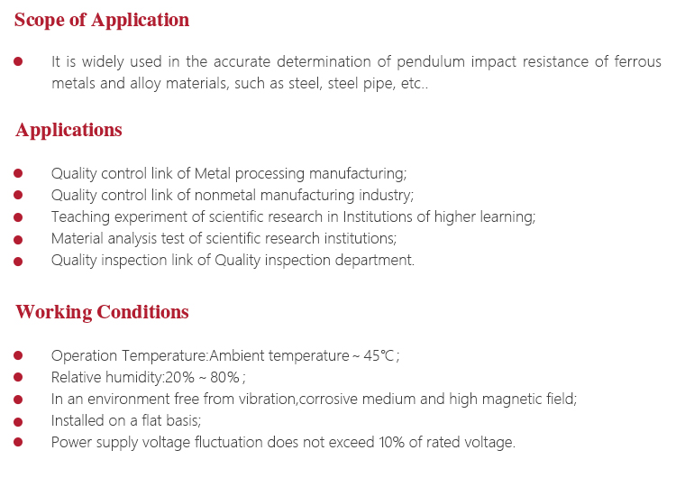 It is widely used in the accurate determination of pendulum impact resistance of ferrous metals and alloy materials, such as steel, steel pipe, etc..