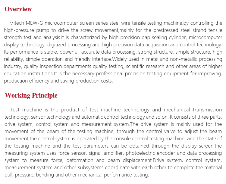 Product OverviewMitech MEW-G microcomputer screen series steel wire tensile testing machine,by controlling the high-pressure pump to drive the screw movement,mainly for the prestressed steel strand tensile strength test and analysis.It is characterized by high precision gap sealing cylinder, microcomputer display technology, digitized processing and high precision data acquisition and control technology. Its performance is stable, powerful, accurate data processing, strong structure, simple structure, high reliability, simple operation and friendly interface.Widely used in metal and non-metallic processing industry, quality inspection departments quality testing, scientific research and other areas of higher education institutions.It is the necessary professional precision testing equipment for improving production efficiency and saving production costs.
