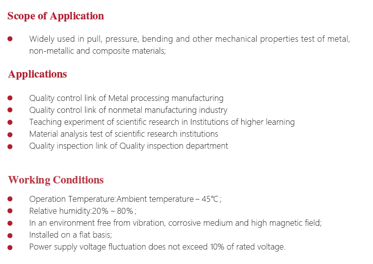 Working PrincipleTest machine is the product of test machine technology and mechanical transmission technology, sensor technology and automatic control technology and so on. It consists of three parts: drive system, control system and measurement system.The drive system is mainly used for the movement of the beam of the testing machine, through the control valve to adjust the beam movement;the control system is operated by the console control testing machine, and the state of the testing machine and the test parameters can be obtained through the display screen;the measuring system uses force sensor, signal amplifier, photoelectric encoder and data processing system to measure force, deformation and beam displacement.Drive system, control system, measurement system and other subsystems coordinate with each other to complete the material pull, pressure, bending and other mechanical performance testing.