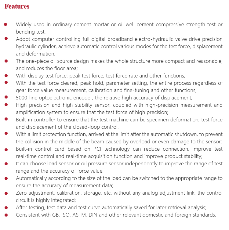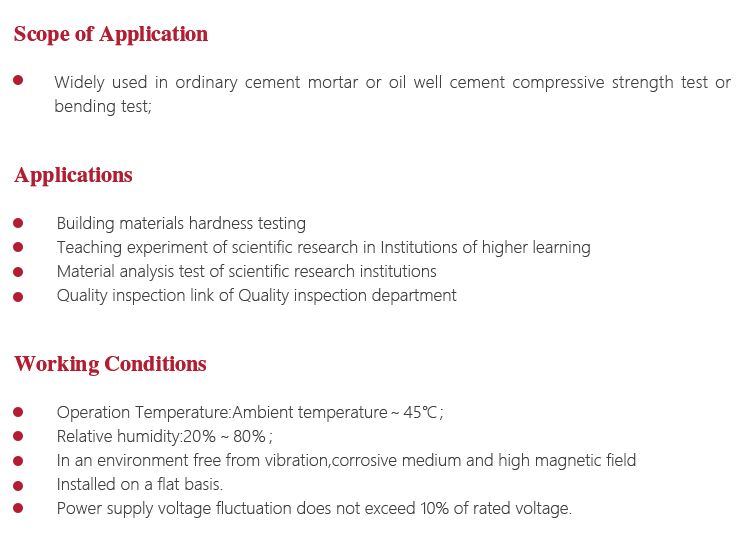Instrument Featuresl Widely used in ordinary cement mortar or oil well cement compressive strength test or bending test;