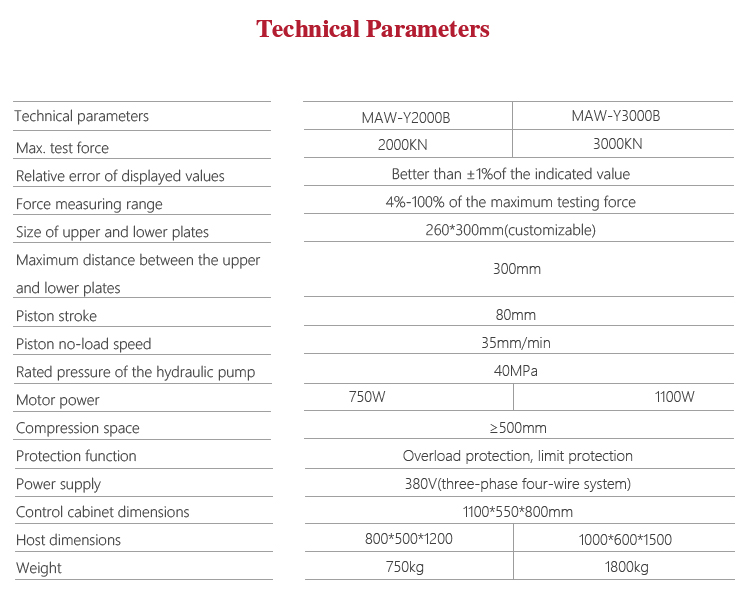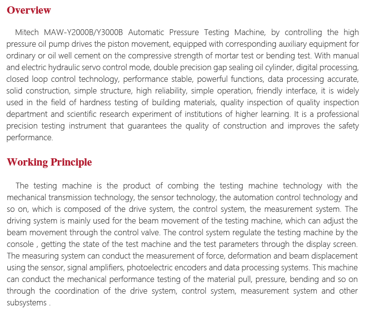Product OverviewMitech MAW-Y3000B Automatic Pressure Testing Machine, by controlling the high pressure oil pump drives the piston movement, equipped with corresponding auxiliary equipment for ordinary or oil well cement on the compressive strength of mortar test or bending test. With manual and electric hydraulic servo control mode, double precision gap sealing oil cylinder, digital processing, closed loop control technology, performance stable, powerful functions, data processing accurate, solid construction, simple structure, high reliability, simple operation, friendly interface, it is widely used in the field of hardness testing of building materials, quality inspection of quality inspection department and scientific research experiment of institutions of higher learning. It is a professional precision testing instrument that guarantees the quality of construction and improves the safety performance.