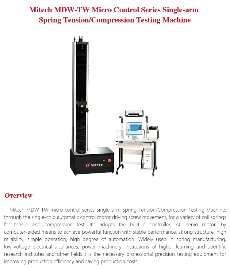 Product OverviewMitech MDW-TW micro control series Single-arm Spring Tension/Compression Testing Machine, through the single-chip automatic control motor driving screw movement, for a variety of coil springs for tensile and compression test. It’s adopts the built-in controller, AC servo motor, by computer-aided means to achieve powerful function with stable performance, strong structure, high reliability, simple operation, high degree of automation. Widely used in spring manufacturing, low-voltage electrical appliances, power machinery, institutions of higher learning and scientific research institutes and other fields.It is the necessary professional precision testing equipment for improving production efficiency and saving production costs.