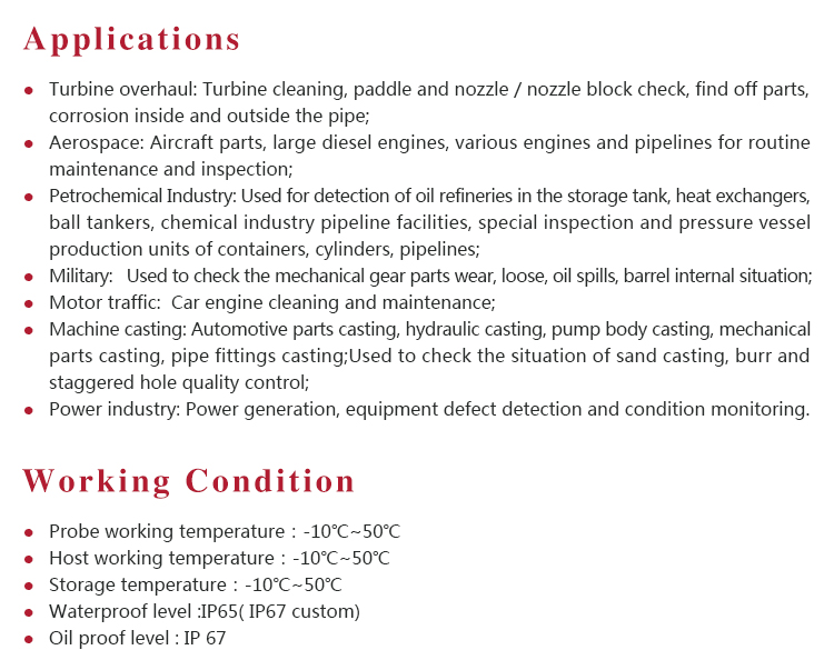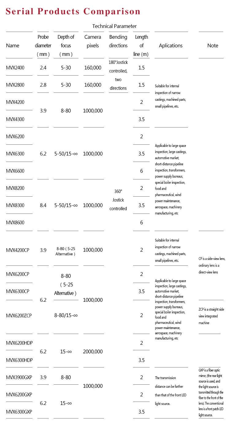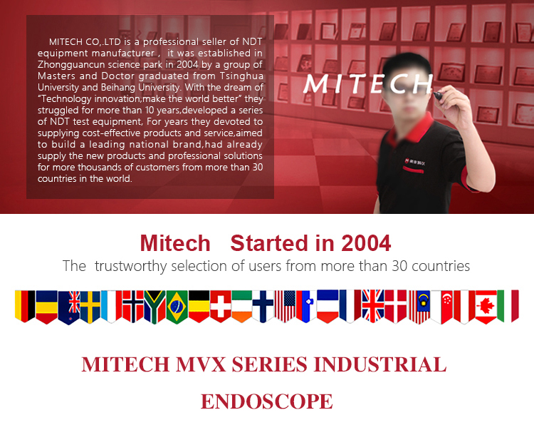 MITECH MVX series of industrial endoscope, based on the CMOS image sensor principle, can realize image shooting in the pipe or narrow area which can not be directly observed. And the results can be displayed with high-definition ,so as to achieve non-destructive testing. MITECH MVX series endoscope is a high-precision video electronics industry endoscope, the use of color LCD display and highly integrated CMOS image sensor to ensure that the video endoscopic image of the clear, realistic; its low power consumption, quick signal transmission speed , and easy to carry,operate, different diameter testing lines can be replaced to achieve multi-purpose use and cost saving. It can detect pipe or narrow spaces without tearing apart or damaging machine while not working.Cracks, welds, foreign body, wear and internal processing of parts and other circumstances can be detected with high quality images. It is widely used in aerospace, petrochemical, mechanical casting, national defense military, power production, automobile transportation and other fields, and is the important detection and monitoring equipment of industrial equipment testing and maintenance and other aspects.