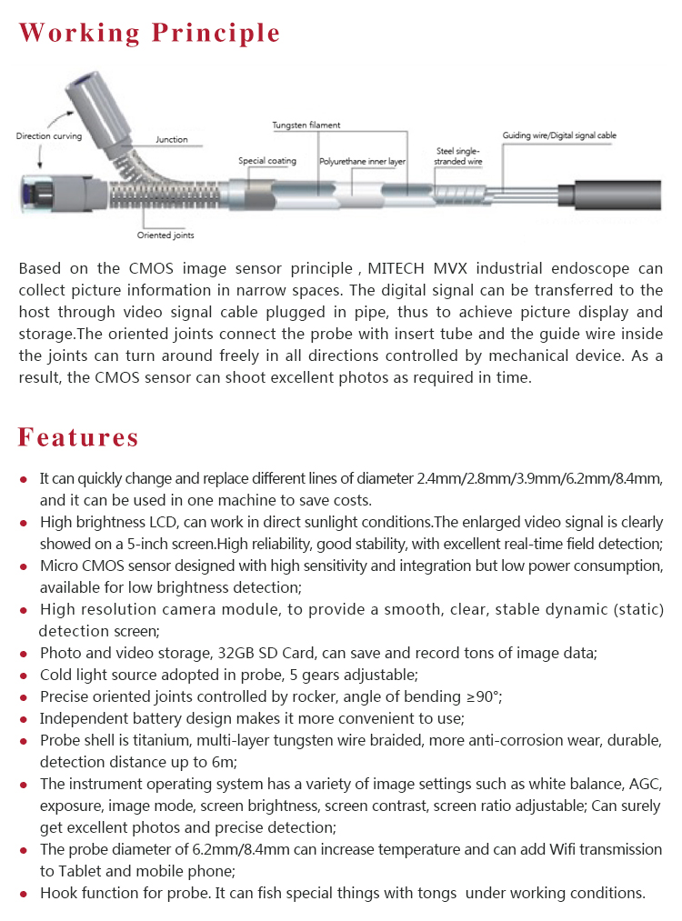 Based on the CMOS image sensor principle,MITECH MVX industrial endoscope can collect picture information in narrow spaces. The digital signal can be transferred to the host through video signal cable plugged in pipe, thus to achieve picture display and storage.The oriented joints connect the probe with insert tube and the guide wire inside the joints can turn around freely in all directions controlled by mechanical device. As a result, the CMOS sensor can shoot excellent photos as required in time.