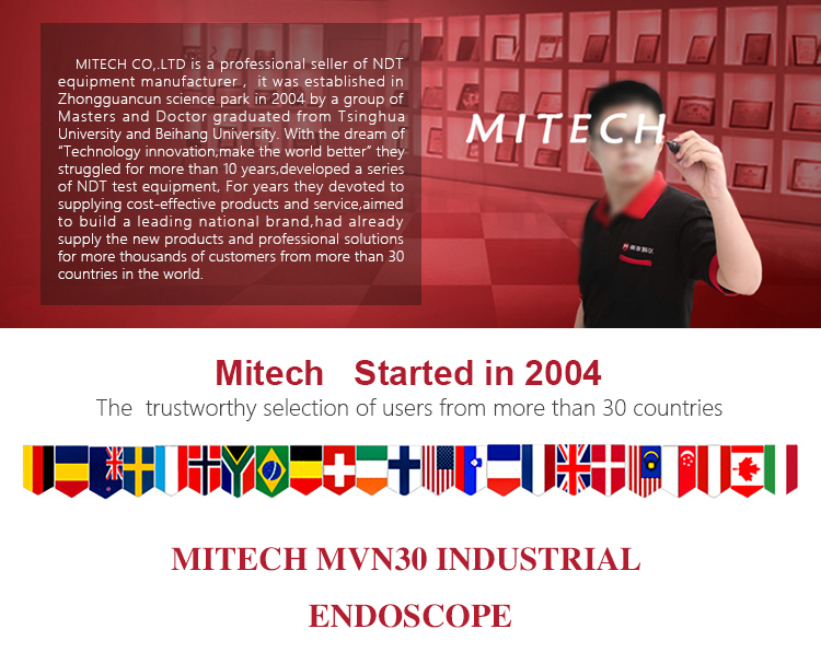 Product OverviewMITECH MVN30 three-in-one industrial endoscope is kind of endoscope integrating the pipe mirror,electronic mirror and ultra-fine straight rod mirror. The use of color LCD display and highly integrated CMOS image sensor to ensure that the video endoscopic image of the clear, realistic; its low power consumption, quick signal transmission speed , and easy to carry,operate.The detection range covers 10,, to 300mm diameter pipes, with a maximum detection distance of 30m. It can detect pipe or narrow spaces without tearing apart or damaging machine while not working.Cracks, welds, foreign body, wear and internal processing of parts and other circumstances can be detected with high quality images. It is widely used in aerospace, petrochemical, mechanical casting, national defense military, power production, automobile transportation and other fields, and is the important detection and monitoring equipment of industrial equipment testing and maintenance and other aspects.