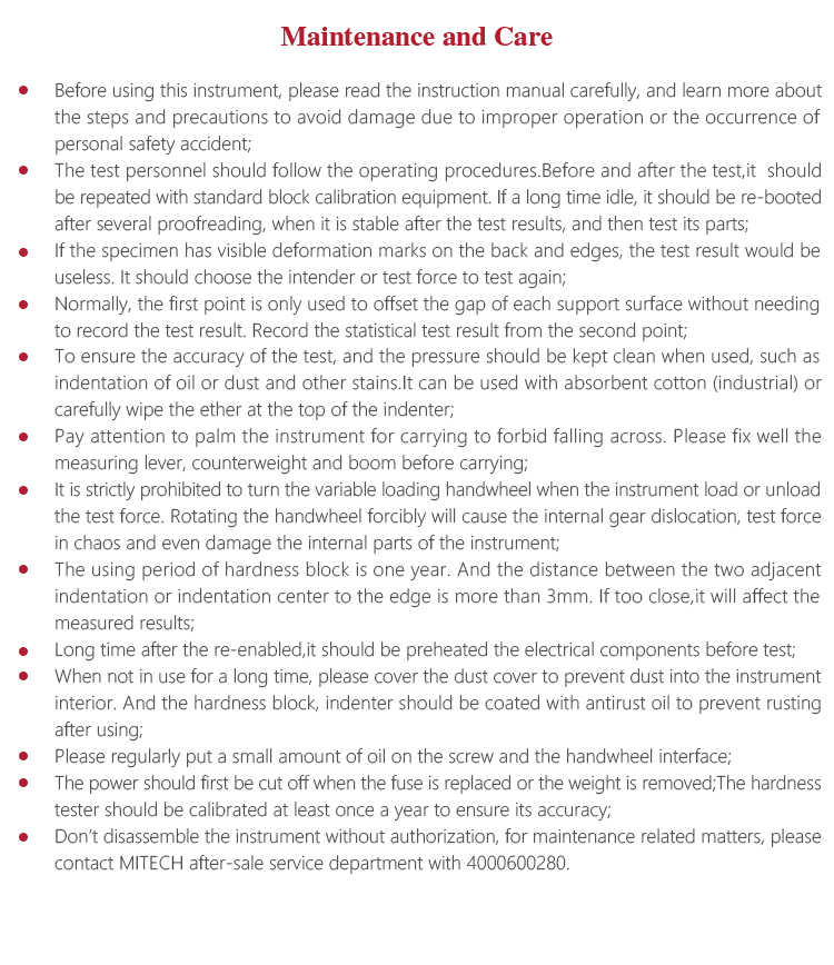 l The power should first be cut off when the fuse is replaced or the weight is removed;The hardness tester should be
