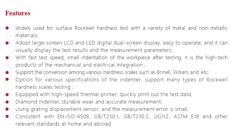 Instrument Featuresl Widely used for surface Rockwell hardness test with a variety of metal and non-metallic materials;