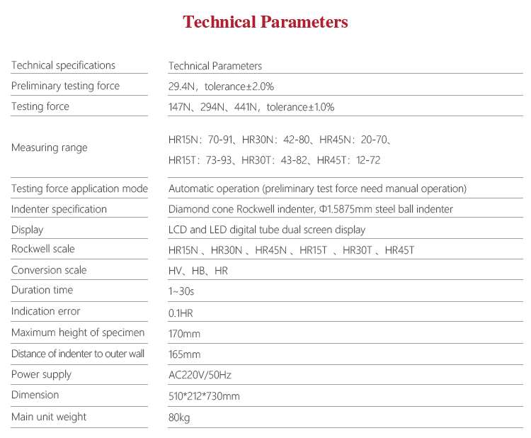 l Option for various specifications of the indenter, support many types of Rockwell hardness scales testing ;
