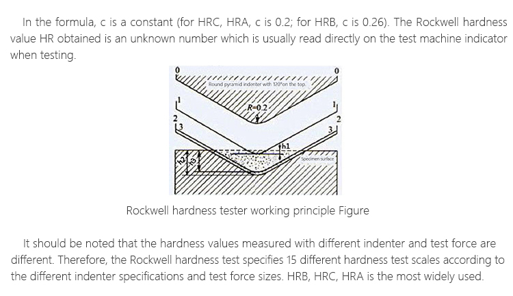 In the formula, c is a constant (for HRC, HRA, c is 0.2; for HRB, c is 0.26). The Rockwell hardness value HR obtained is an unknown number which is usually read directly on the test machine indicator when testing.