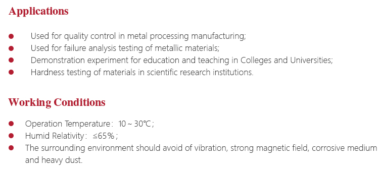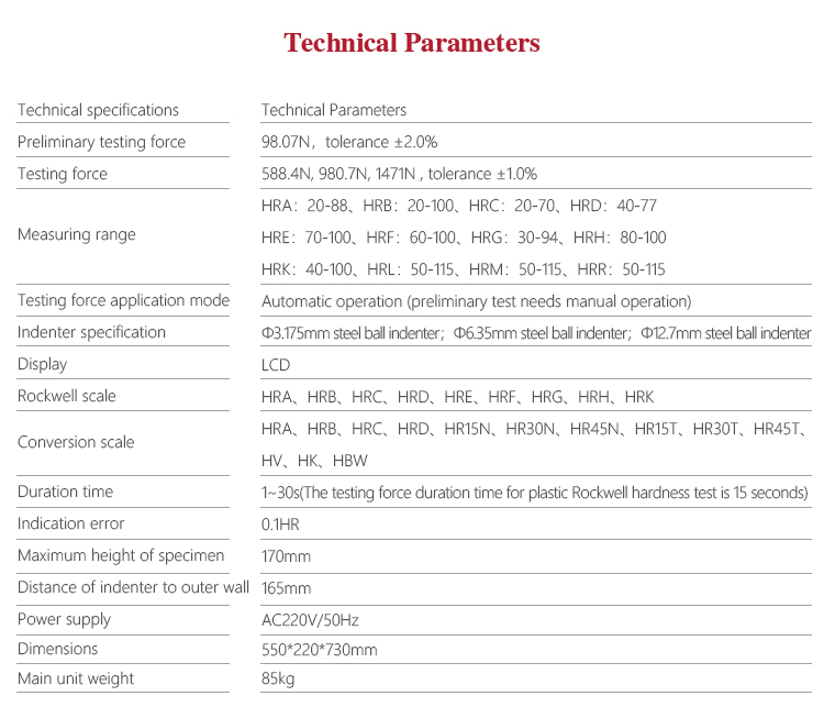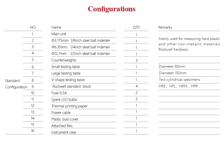 l Option for various specifications of the indenter, support many types of Rockwell hardness scales testing ;