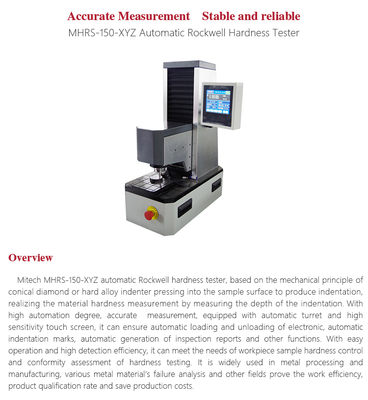 Mitech MHRS-150-XYZ automatic Rockwell hardness tester, based on the mechanical principle of conical diamond or hard alloy indenter pressing into the sample surface to produce indentation, realizing the material hardness measurement by measuring the depth of the indentation. With high automation degree, accurate measurement, equipped with automatic turret and high sensitivity touch screen, it can ensure automatic loading and unloading of electronic, automatic indentation marks, automatic generation of inspection reports and other functions. With easy operation and high detection efficiency, it can meet the needs of workpiece sample hardness control and conformity assessment of hardness testing. It is widely used in metal processing and manufacturing, various metal material’s failure analysis and other fields like colleges and research institutions. it is the professional precision testing equipment to improve the work efficiency, product qualification rate and save production costs.