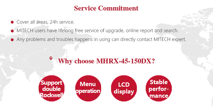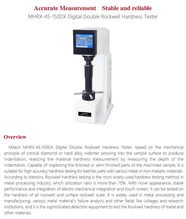 Product OverviewMitech MHRX-45-150DX Digital Double Rockwell Hardness Tester, based on the mechanical principle of conical diamond or hard alloy indenter pressing into the sample surface to produce indentation, realizing the material hardness measurement by measuring the depth of the indentation. Capable of inspecting the finished or semi-finished parts of the machined sample, it is suitable for high accuracy hardness testing for batches parts with various metal or non-metallic materials. According to statistics, Rockwell hardness testing is the most widely used hardness testing method in metal processing industry, which utilization ratio is more than 70%. With novel appearance, stable performance and integration of electro mechanical integration and touch screen, it can be tested on the hardness of all rockwell and surface rockwell scale. It is widely used in metal processing and manufacturing, various metal material’s failure analysis and other fields like colleges and research institutions, and it is the sophisticated detection equipment to test the Rockwell hardness of metal and other materials.