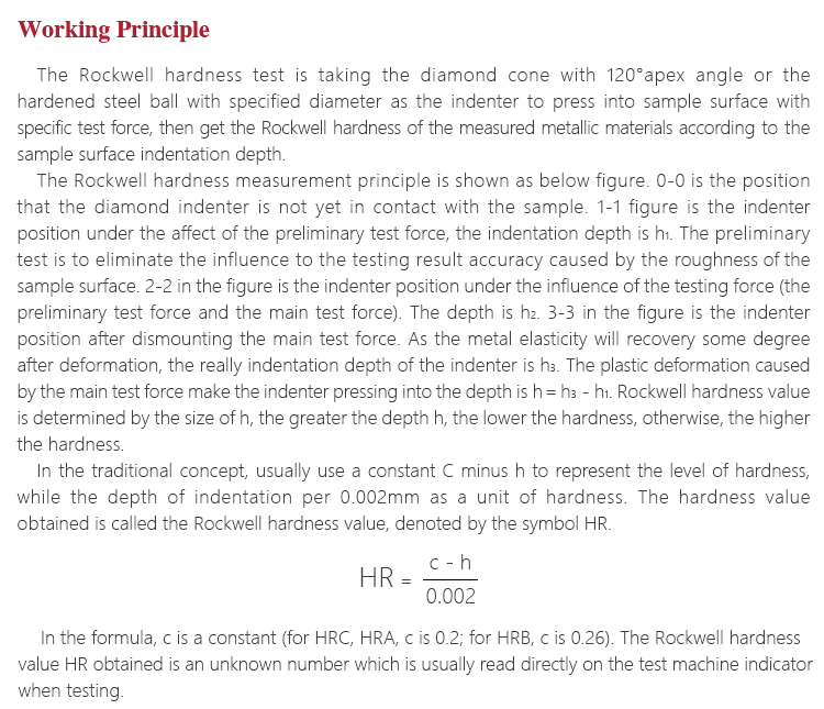 In the formula, c is a constant (for HRC, HRA, c is 0.2; for HRB, c is 0.26). The Rockwell hardness value HR obtained is an unknown number which is usually read directly on the test machine indicator when testing.
