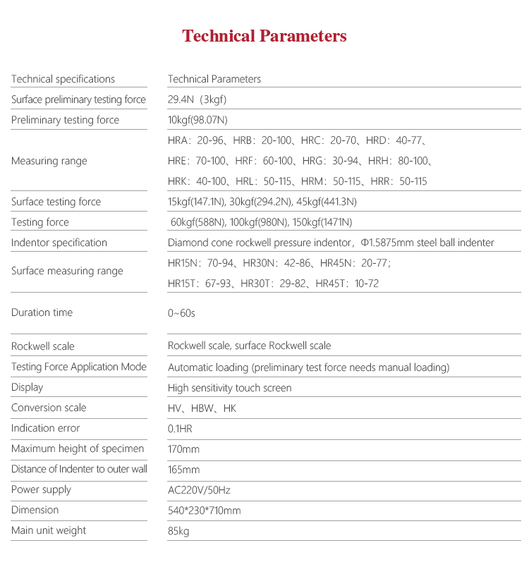 | Indentor specification | Diamond cone rockwell pressure indentor,Φ1.5875mm steel ball indenter |