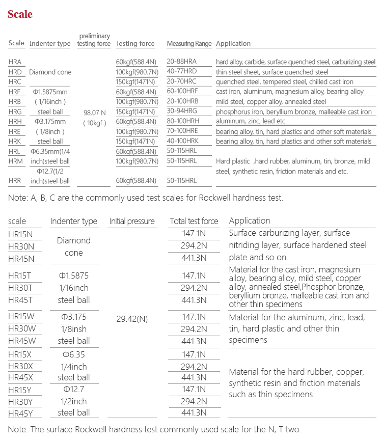 It should be noted that the measured hardness values would be different with different indenter and test force. Therefore, the Rockwell hardness testing specifies 15 different hardness test scales according to the different indenter specification and test force sizes. And the HRB, HRC, HRA are the most widely used.
