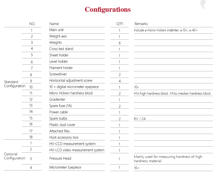 Instrument FeaturesWidely used in micro-specimen, thin specimen, surface coating, heat treatment of workpiece surface samples and etc.Vickers hardness test to meet different demands of scientific research institutions, precision machining and quality inspection departments and other materials research;