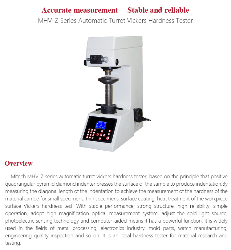 Product OverviewMitech MHV-Z series automatic turret vickers hardness tester, based on the principle that positive quadrangular pyramid diamond indenter presses the surface of the sample to produce indentation.By measuring the diagonal length of the indentation to achieve the measurement of the hardness of the material can be for small specimens, thin specimens, surface coating, heat treatment of the workpiece surface Vickers hardness test. With stable performance, strong structure, high reliability, simple operation, adopt high magnification optical measurement system, adjust the cold light source, photoelectric sensing technology and computer-aided means it has a powerful function. It is widely used in the fields of metal processing, electronics industry, mold parts, watch manufacturing, engineering quality inspection and so on. It is an ideal hardness tester for material research and testing