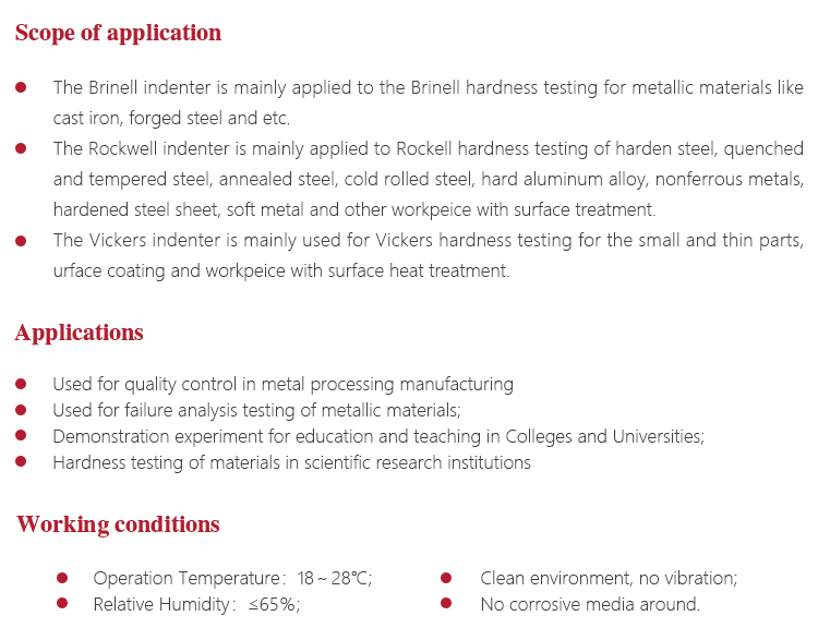| Vickers testing force | 294N(30kg), 980N(100kg)Tolerance±1.0% |