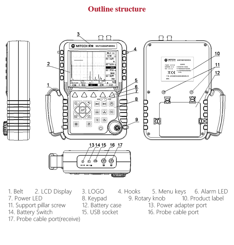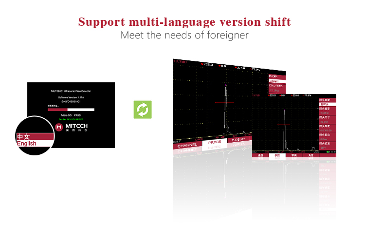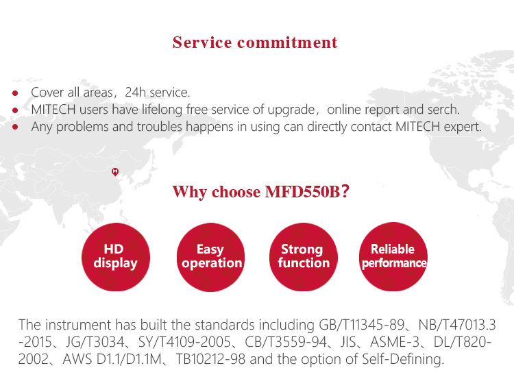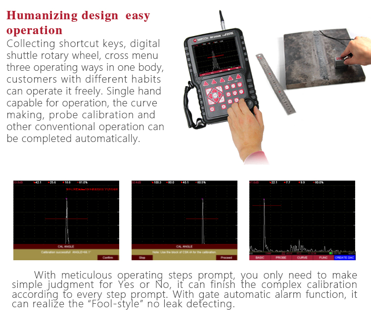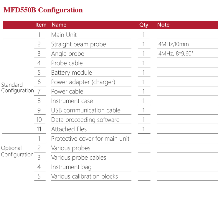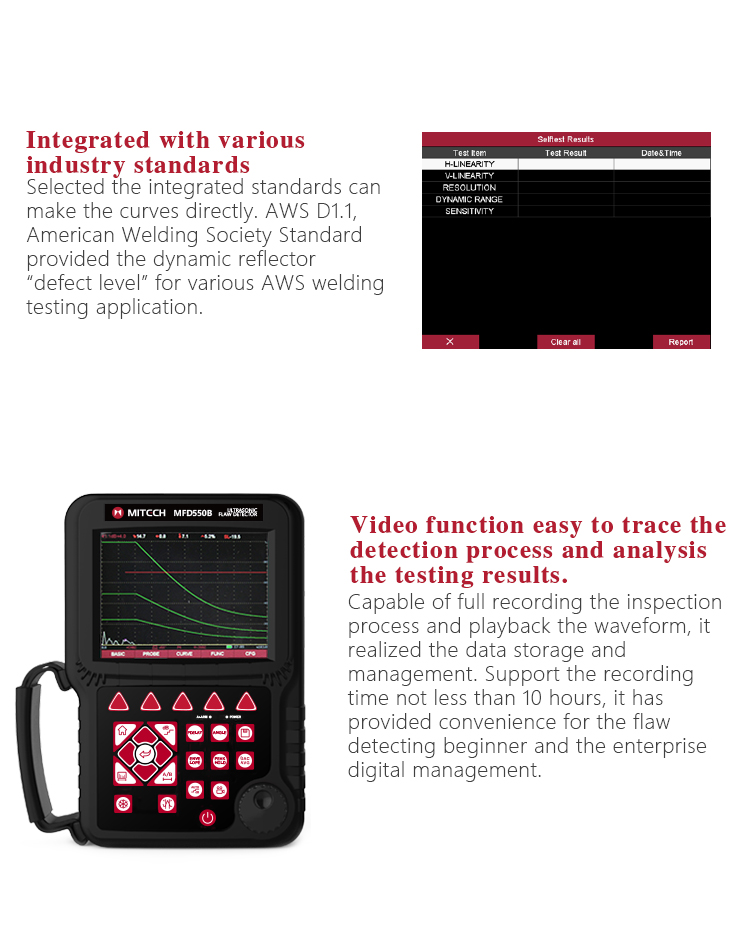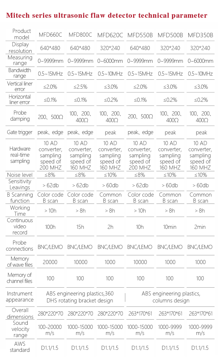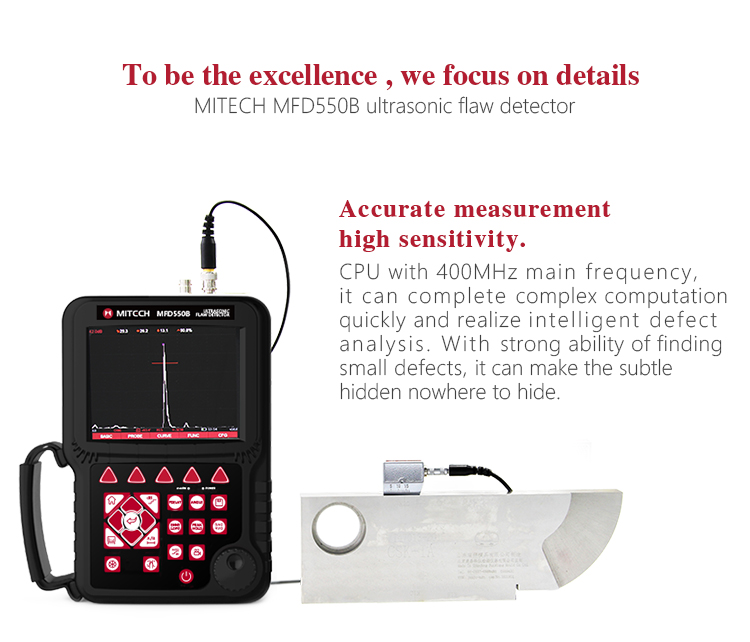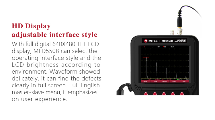 Product OverviewBased on ultrasonic principle, digital ultrasonic flaw detector MFD550B can test, orient, evaluate and diagnose various flaws such as crack, lard, air hole in workpiece’s interior swiftly and accurately without any destruction. With full digital 640X480 TFT LCD display, it show the defect clearly under the dim light and strong sunlight environment. 0-9999mm measuring range can meet the requirement for general defect inspection in manufacturing industry, metallurgical industry, metal processing industry, chemical industry and so on. Low power design with large capacity and high performance lithium ion battery module,it can work more than 10 hours continuously. Full English master-slave menu, emphasizing on user experience, collecting shortcut keys, digital shuttle rotary wheel, cross menu three operating ways inone body, customers with different habits can operate it freely. With comprehensive performance self-checking function, it can automatically generate test reports and support for many languages. With high cost performance, it is the smart choice for the practical economic model of ultrasonic testingequipment.