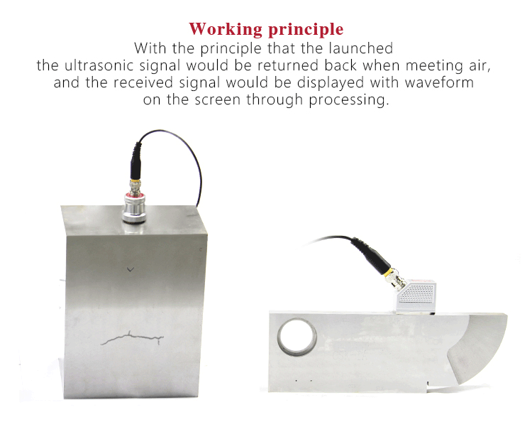 Working PrincipleWhen presence of a defect in a workpiece with homogenous material, due to the defects, it will inform the interface among different mediums between the defect and workpiece. As the acoustic resistance is different at the interface, after the pulsing ultrasonic wave met the interface, it will produce reflection. The reflected energy will be received by the probe. Then it will show a reflection waveform in a certain abscissa position in the display screen which is the defect depth in the workpiece. The height and shape of reflecting wave would be different caused by the different defects which reflect the defect’s character.