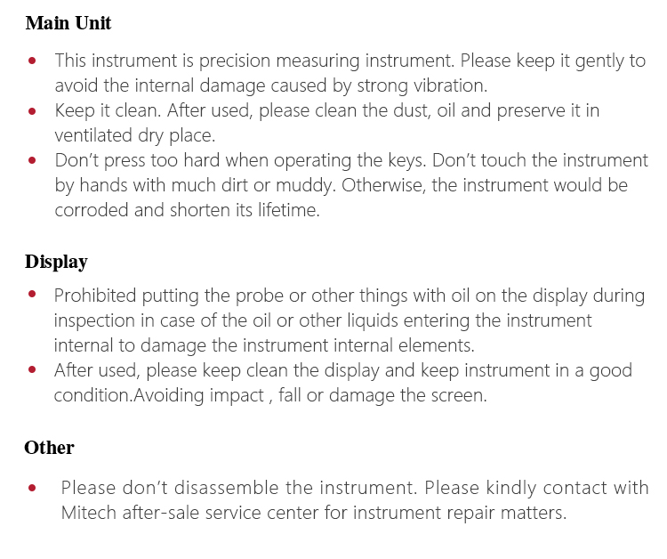 4. Please avoid oil, water or other liquids into the instrument and clean the instrument surface regularly.