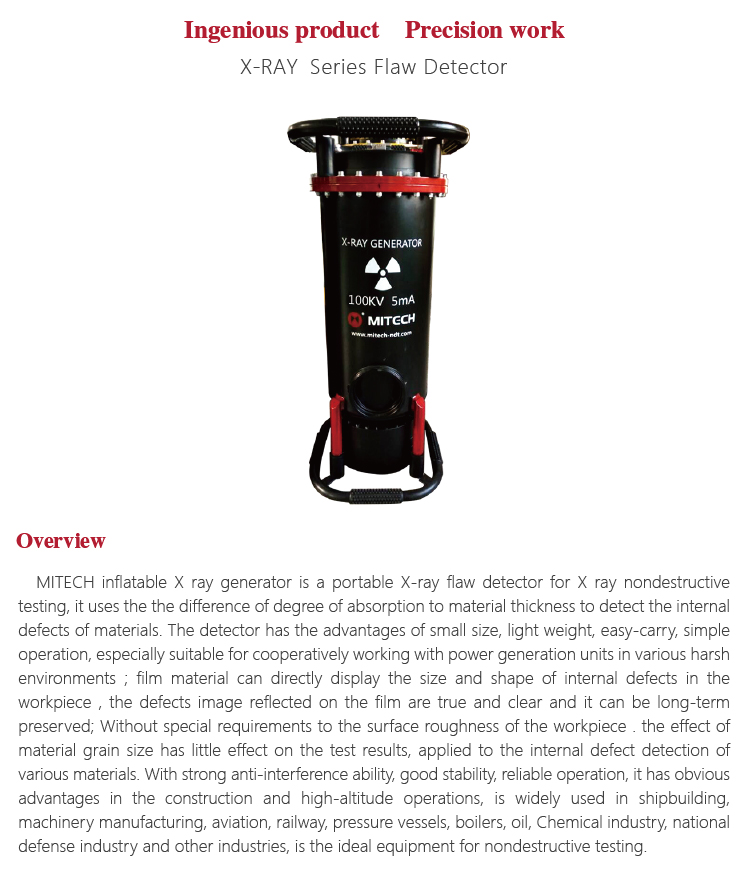 MITECH inflatable X ray generator is a portable X-ray flaw detector for X ray nondestructive testing, it uses the the difference of degree of absorption to material thickness to detect the internal defects of materials. The detector has the advantages of small size, light weight, easy-carry, simple operation, especially suitable for cooperatively working with power generation units in various harsh environments ; film material can directly display the size and shape of internal defects in the workpiece , the defects image reflected on the film are true and clear and it can be long-term preserved; Without special requirements to the surface roughness of the workpiece . the effect of material grain size has little effect on the test results, applied to the internal defect detection of various materials. With strong anti-interference ability, good stability, reliable operation, it has obvious advantages in the construction and high-altitude operations, is widely used in shipbuilding, machinery manufacturing, aviation, railway, pressure vessels, boilers, oil, Chemical industry, national defense industry and other industries, is the ideal equipment for nondestructive testing.