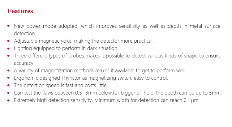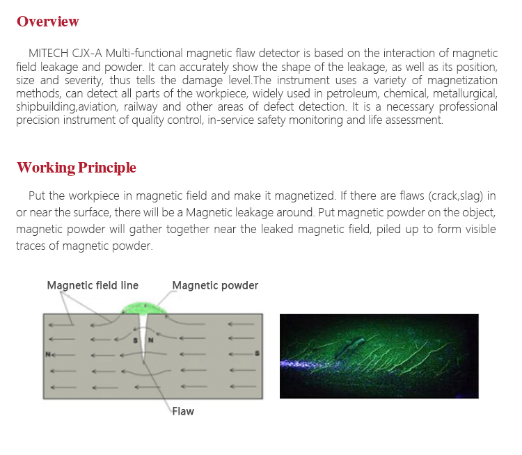 MITECH CJX-A Multi-functional magnetic flaw detector is based on the interaction of magnetic field leakage and powder. It can accurately show the shape of the leakage, as well as its position, size and severity, thus tells the damage level.The instrument uses a variety of magnetization methods, can detect all parts of the workpiece, widely used in petroleum, chemical, metallurgical, shipbuilding,aviation, railway and other areas of defect detection. It is a necessary professional precision instrument of quality control, in-service safety monitoring and life assessment.