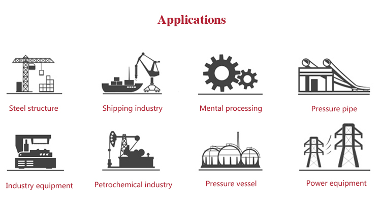 It is widely used in the industry of aircraft manufacturing, boiler and pressure vessel, electric, oil field, shipbuilding, combustion engine parts, mine, machinery, standard parts, oil pump, vehicle parts, bridging, chemical, railway, large mechanical components, steel structure etc.
