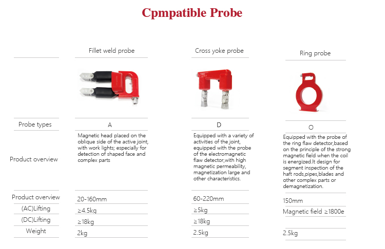 Type D probe is also called magnetic yoke probe, equips with various high magnetic turning joint, the turning joint can closely tie to the fillet weld, use magnetic suspending liquid make it magnetized, the crack in front of probe can be showed out.