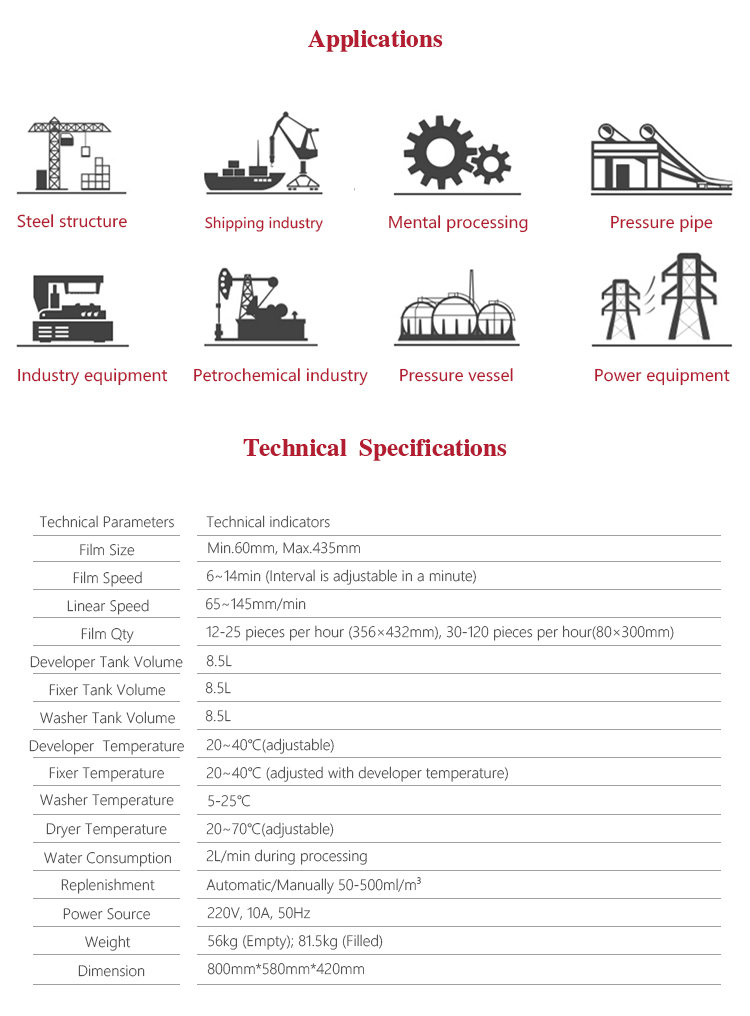 Product OverviewMFP17-B fully automatic film processor is the new generation product of Mitech Co.,Ltd. It has super digital display board, the microcomputer control system and dense array type roller group can transfer various size film. The countdown monitoring function makes the circulation work finished in one minute and enter the standby mode automatically. Processing liquid can automatically cycle and replenish to keep the liquid fresh. Professional prototype drying duct system makes both sides of the film dried with no water print. It is widely used for monitoring various pipelines and pressure vessels in the fields of petroleum, chemical, metallurgy, shipbuilding, aviation, aerospace and so on.