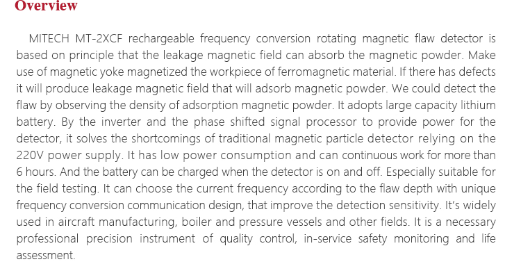 Product OverviewMITECH MT-2XCF rechargeable frequency conversion rotating magnetic flaw detector is based on principle that the leakage magnetic field can absorb the magnetic powder. Make use of magnetic yoke magnetized the workpiece of ferromagnetic material. If there has defects it will produce leakage magnetic field that will adsorb magnetic powder. We could detect the flaw by observing the density of adsorption magnetic powder. It adopts large capacity lithium battery. By the inverter and the phase shifted signal processor to provide power for the detector, it solves the shortcomings of traditional magnetic particle detector relying on the 220V power supply. It has low power consumption and can continuous work for more than 6 hours. And the battery can be charged when the detector is on and off. Especially suitable for the field testing. It can choose the current frequency according to the flaw depth with unique frequency conversion communication design, that improve the detection sensitivity. It’s widely used in aircraft manufacturing, boiler and pressure vessels and other fields. It is a necessary professional precision instrument of quality control, in-service safety monitoring and life assessment.