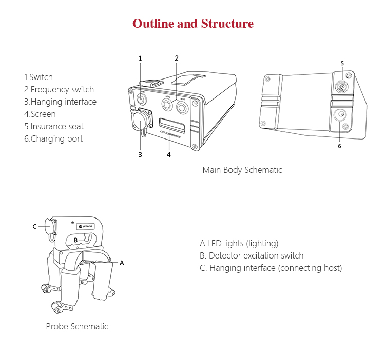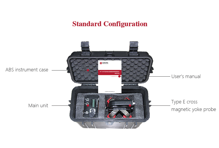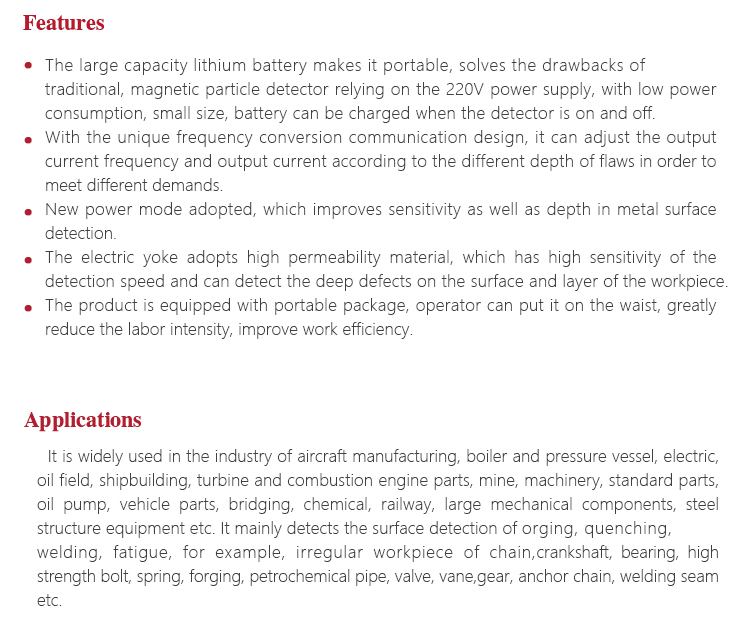 Instrument Featuresl The large capacity lithium battery makes it portable, solves the drawbacks of traditional, magnetic particle detector relying on the 220V power supply, with low power consumption, small size, battery can be charged when the detector is on and off.