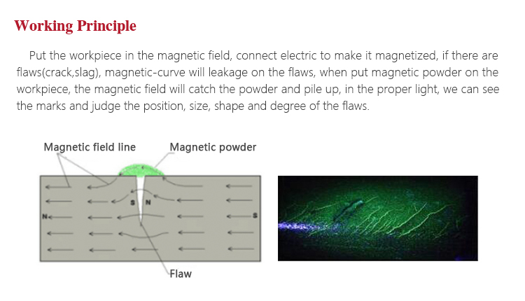 Working PrinciplePut the workpiece in the magnetic field, connect electric to make it magnetized, if there are flaws(crack,slag), magnetic-curve will leakage on the flaws, when put magnetic powder on the workpiece, the magnetic field will catch the powder and pile up, in the proper light, we can see the marks and judge the position, size, shape and degree of the flaws.