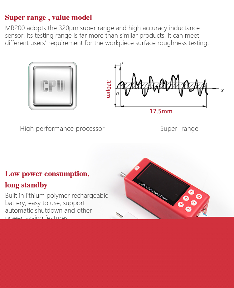 The MR200 surface roughness tester is a new upgrade instrument which adopts the newest processor. This instrument adopts 2.7 inch OLED display, combines accurate measurement, exquisite design, fast process rate and complete protection in one host. It is highly favored by users since it was produced, it has large measurement range, superior than other similar products and can meet different needs of users. By connecting with Micro-USB port, Bluetooth, SD card, it can do wireless remote control, measurement, print and communicate with PC and store massive data. It has been widely used in the quality control process of various precision metals, plays an important and necessary role in rising production qualification rate and saving cost.