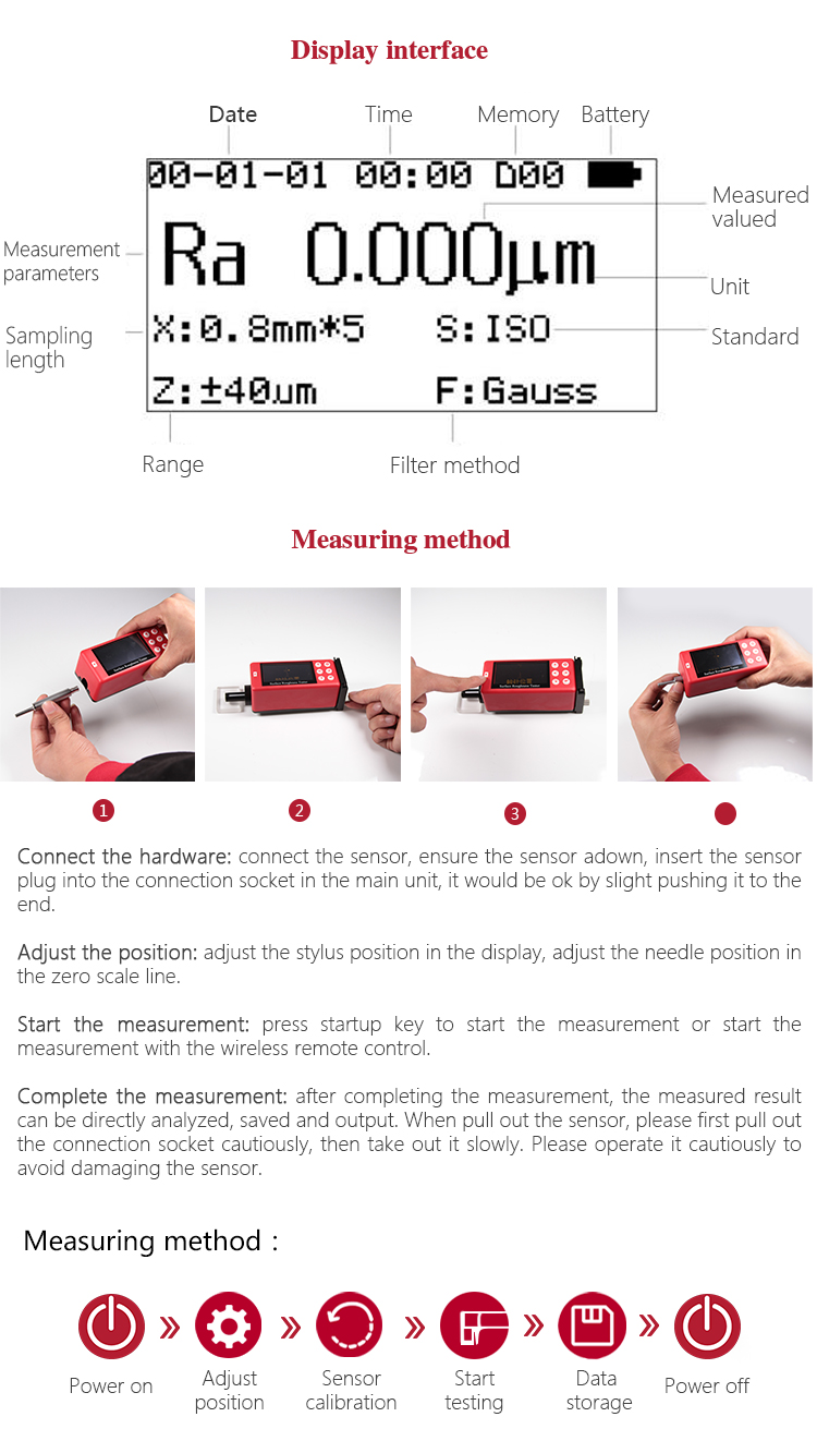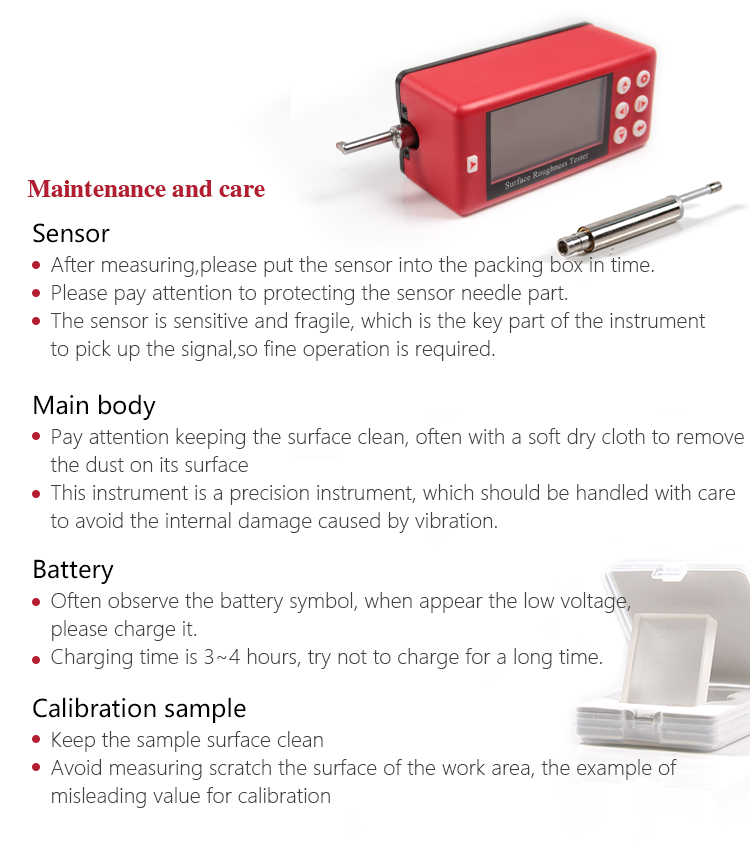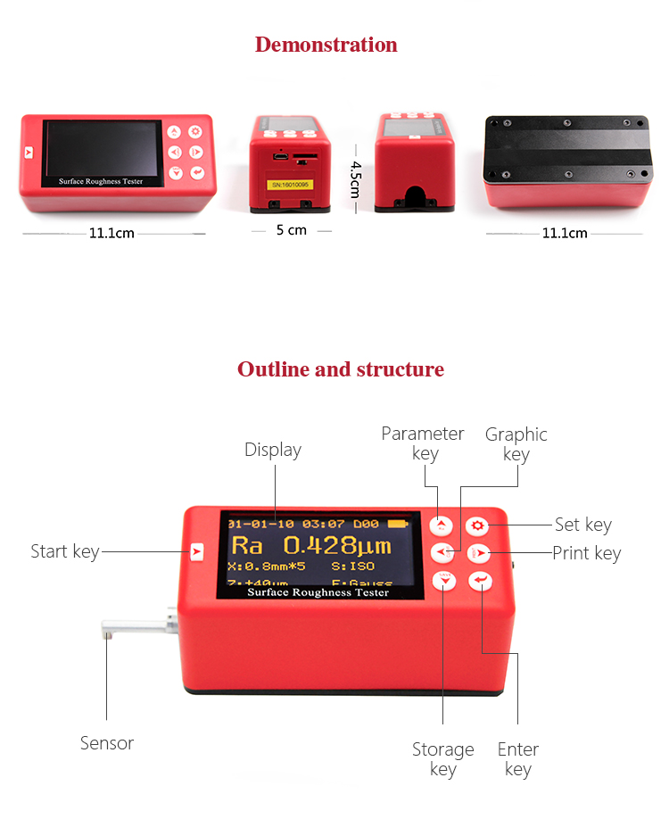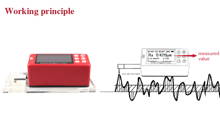 When measuring roughness of part surface, the probe is placed on the surface of the part and then tracing the surface at constant rate. The probe acquires the surface roughness by the sharp stylus in probe. The roughness causes displacement of probe which results in change of inductive value of induction coils thus generate analogue signal which is in proportion to surface roughness at output end of phase-sensitive rectifier. This signal enters data collection system after amplification and level conversion. After that, those collected data are processed with digital filtering and parameter calculation by ARM chip and the measuring result can be read on OLED display. The results can be printed by Bluetooth printer.