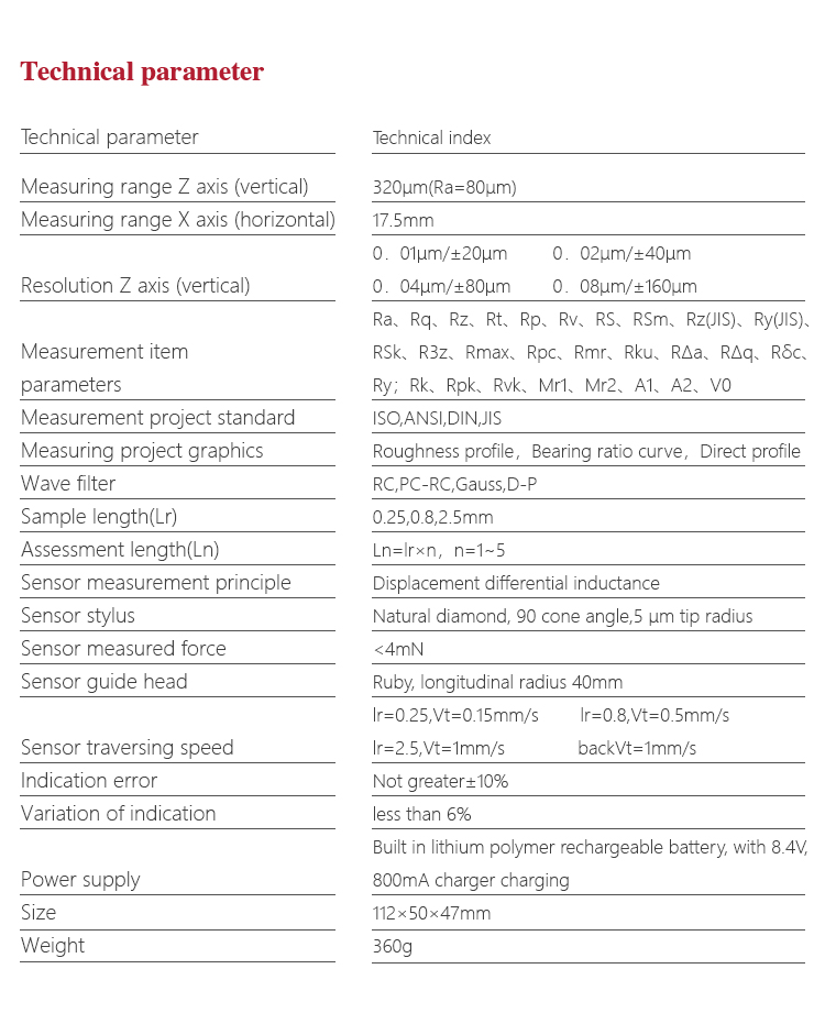 • Measurement range: Z Axis(Vertical)320μm(Ra=80μm),X Axis(Horizontal)17.5mm