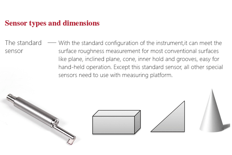 The standard sensor of Mitech portable surface roughness tester MR200,  length: 80.5mm, main body length: 46mm, guide-head bearer length: 23mm, main body diameter of Φ10mm, core-insert sleeve diameter of Φ7mm, guide-head height of 8.7mm, it is the standard configuration of the surface roughness tester. The standard sensor can meet the surface roughness measurement for most conventional surfaces like plane, inclined plane, cone, inner hold and grooves, easy for hand-held operation. Except this standard sensor, all other special sensors need to use with measuring platform.