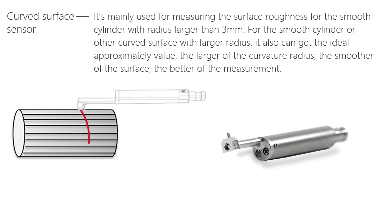 The curved surface sensor of Mitech portable surface roughness tester MR200, with totally length of 78mm, main body length of 46mm, guide-head bearer length of 20mm, main body diameter of Φ10mm, core-insert sleeve diameter of Φ7mm, guide-head height of 7.8mm, It is the optional configuration of the surface roughness tester, mainly used for measuring the surface roughness for the smooth cylinder with radius larger than 3mm. For the smooth cylinder or other curved surface with larger radius, it also can get the ideal approximately value, the larger of the curvature radius, the smoother of the surface, the better the measurement.