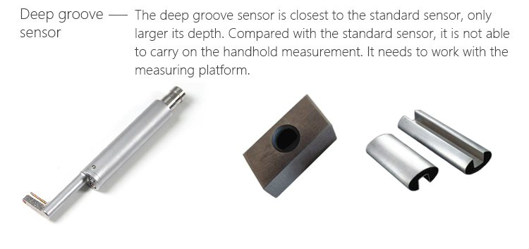 The deep groove sensor of Mitech portable surface roughness tester MR200, with totally length of 80.5mm, main body length of 46mm, guide-head bearer length of 23mm, main body diameter of Φ10mm, core-insert sleeve diameter of Φ7mm, guide-head height of 14.2mm, It is the optional configuration of the surface roughness tester, mainly used for measuring the roughness for various surfaces like plane, inclined plane, cone, inner hold and grooves. The deep groove sensor is closest to the standard sensor, only larger its depth. Compared with the standard sensor, it is not able to carry on the handheld measurement. It needs to work with the measuring platform, mainly for measuring the roughness of the workpeice with the depth which the standard sensor can’t reach.