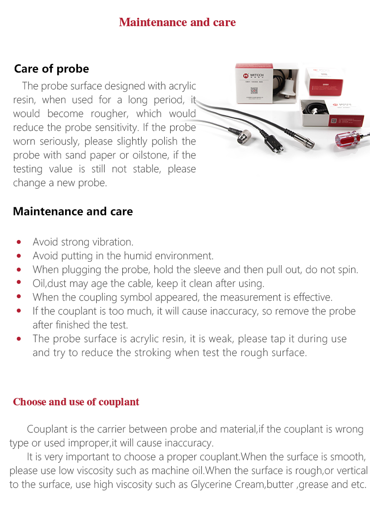 The couplant coated on the probe and the measured workpiece surface as the medium to isolate the air between them, selecting the proper viscosity couplant is the critical thing for the precisely measurement. Mitech series ultrasonic thickness gauge standard 75mm ultrasonic special couplant in the configuration for isolating the air between the ultrasonic probe and the workpiece surface, which can make probe produced ultrasonic wave into the workpiece effectively to ensure the accurate measurement of thickness. The couplant with squeeze bottle packing, it is clean and environmental. It is recommended to select the low viscosity couplant for measuring the smooth material and select the high viscosity couplant (like glycerine cream, butter and so on) for measuring the rough material.